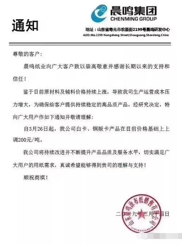 晨鳴集團:自3月26日起,我公司白卡、銅板卡產品在目前價格基礎上上調200元/噸。