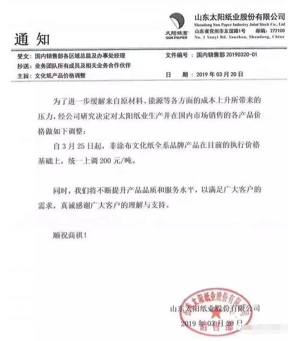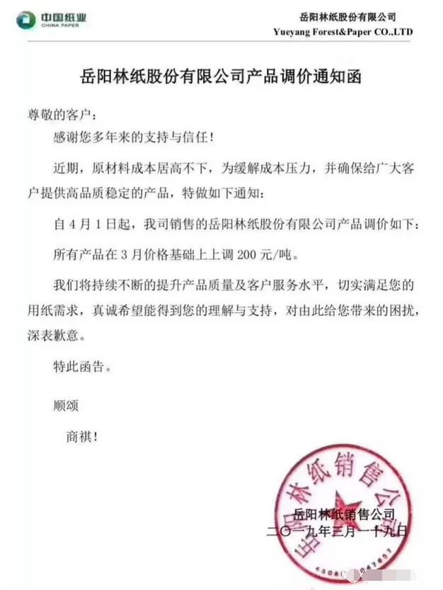 亞太森博(廣東)紙業有限公司:由于原材料價格持續上漲,為緩解成本壓力,我司決定針對旗下的全線品牌復印紙及代加工品牌價格上調200元/噸(含稅),自2019年4月1日起生效。