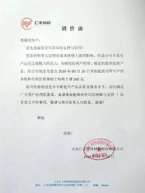 山東仁豐特種材料有限公司:受原材料等大宗物資成本持續上漲的影響,給我公司正常生產運營造成極大的壓力,為確保給用戶持續、穩定的提供優質產品,經公司慎重考慮自2019年03月20日開始起我司所生產的各紙種在原價格基礎上每噸上調200元。