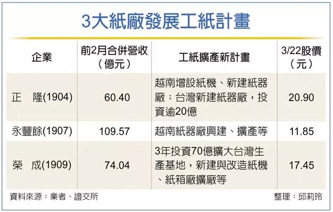 1、榮成擴(kuò)大臺灣基地,2020年工紙年產(chǎn)能將超越永豐余 榮成八成營收來自大陸市場,今年起的三年內(nèi)預(yù)計投資70億元,分三階段擴(kuò)大臺灣生產(chǎn)基地,進(jìn)行新建及升級改造低碳造紙工紙廠紙機(jī)、綠色包裝紙箱廠產(chǎn)線汰舊換新、自動化智慧化升級改造等項(xiàng)目,將可新增166個工作機(jī)會,2020年底前將工紙年產(chǎn)能增至85萬噸,將超越永豐余,僅次于正隆,同時拓展國際競爭力,粗估三年后營收增加約50億元。 榮成將在彰化二林廠新建一臺年產(chǎn)20萬噸紙機(jī),升級改造一臺紙機(jī),使工紙年產(chǎn)能從目前65萬噸增至85萬噸,并優(yōu)化產(chǎn)品組合,切入國內(nèi)高品質(zhì)輕磅化的紙箱紙板市場,并拓展東南亞及大陸市場。 榮成也要將臺灣紙箱生產(chǎn)線升級及擴(kuò)充產(chǎn)能,去年底向關(guān)聯(lián)企業(yè)寶隆購入云林九筆土地、總面積4894.4坪,將作為云林紙箱廠擴(kuò)廠使用,以提高自有紙箱廠銷售占比,也可滿足臺商回臺投資設(shè)廠的產(chǎn)品包裝需求。 2、 正隆計劃于臺灣新建紙器廠,預(yù)估投資額逾20億元 正隆目前在臺灣工紙年產(chǎn)能約168萬噸居冠,看好臺商回流帶動紙箱需求,在臺灣的燕巢廠也規(guī)劃新建紙器廠,年產(chǎn)約1.8億平方公尺,連同土建、購買設(shè)備等,粗估投資額逾20億元。 正隆近日也計劃加碼投資越南,為拓展快速成長的東南亞市場,規(guī)劃在越南的平陽造紙廠增設(shè)二號紙機(jī),年產(chǎn)40萬噸面紙,預(yù)計2021年投產(chǎn),并將新建紙器廠,連同年產(chǎn)30萬噸芯紙,在料源穩(wěn)定下,採造紙紙器一貫作業(yè),降低成本、掌握品質(zhì),提升獲利、市占。另外,下半年還有在北越河內(nèi)新建紙器廠計劃。 3、永豐余在臺灣、越南擴(kuò)產(chǎn)能 永豐余也看好各項(xiàng)生產(chǎn)要素成熟的越南,是中美貿(mào)易戰(zhàn)受惠者之一,在北越興建兩座紙器廠,預(yù)計上半年投產(chǎn),月產(chǎn)能增加700萬~800萬平方公尺,在南越已投產(chǎn)的四座紙器廠,月產(chǎn)能2,600萬平方公尺,也有擴(kuò)產(chǎn)計劃。 至于在臺灣,永豐余審慎評估同業(yè)資本支出對市場的影響,以及臺商回流帶來的商機(jī)。目前在臺灣的新屋廠有三臺紙機(jī),總計年產(chǎn)能72萬噸,包括一臺年產(chǎn)30萬噸芯紙機(jī),堪稱臺灣工紙廠最大產(chǎn)能芯紙機(jī),2017年投產(chǎn),另桃園紙器廠設(shè)備持續(xù)汰舊換新與升級,提升產(chǎn)能。 說明:文中所有價格單位均指“新臺幣”。