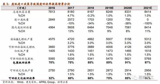 導(dǎo)語:根據(jù)近來龍頭紙企發(fā)布的2018年度業(yè)績報(bào)告來看,不少紙企2018年盈利情況差強(qiáng)人意,對此,不少紙企皆表明是受廢紙價(jià)格上漲、原紙價(jià)格漲不動(dòng)所致。那么,為何18年廢紙進(jìn)口量減少,紙價(jià)卻漲幅甚微?為何紙業(yè)企業(yè)近期庫存較高,但依然有信心提價(jià)? 龍頭紙企2018年度業(yè)績差強(qiáng)人意,行業(yè)景氣度走低 根據(jù)近來龍頭紙企發(fā)布的2018年度業(yè)績報(bào)告來看,不少紙企2018年盈利情況差強(qiáng)人意,對此,不少紙企皆表明是受廢紙價(jià)格上漲、原紙價(jià)格漲不動(dòng)所致。 早在2016年之時(shí),我國造紙業(yè)曾迎來了短暫的“春天”,呈現(xiàn)出了異常繁榮的市場行情。數(shù)據(jù)顯示,2016年全國紙及紙板生產(chǎn)量10855萬噸,同比增長1.35%;消費(fèi)量10419萬噸,同比增長0.65%。37家紙業(yè)上市公司中有32家營收取得增長,實(shí)現(xiàn)營收突破2000億元達(dá)2204.14億元,相比于2015年的1991.60億元,增長了10.67%。 具體而言,實(shí)現(xiàn)營收排名前三的分別是玖龍紙業(yè)(320.93億元)、晨鳴紙業(yè)(229.07億元)、恒安國際(192.77億元)。值得注意的是,山鷹紙業(yè)、華泰股份和維達(dá)國際成為“100億”企業(yè)里的新員。而正業(yè)國際當(dāng)年?duì)I收也達(dá)到了20.74億元,同比增長14.71%。 然而近兩年來,在國際上受到貿(mào)易戰(zhàn)的影響加之國內(nèi)受到環(huán)保政策的緊壓,造紙行業(yè)似乎過得有點(diǎn)暗淡。當(dāng)時(shí)間來到2018年之時(shí),不僅是正業(yè)國際,幾乎是整個(gè)造紙行業(yè)都過得不太好,形勢都不太樂觀,行業(yè)整體景氣度不斷走低。 我們還是以常年蟬聯(lián)紙業(yè)冠軍的玖龍紙業(yè)為例,據(jù)公司早些日子發(fā)布的2019財(cái)年中期業(yè)績報(bào)告顯示,截至2018年12月31日止6個(gè)月,集團(tuán)實(shí)現(xiàn)銷售額達(dá)到303.28億元,同比增長18.2%;毛利47.13億元,同比下降25.1%;毛利率由24.5%減少至約15.5%; 公司權(quán)益持有人應(yīng)占盈利22.59億元,同比減少47.81%;除匯兌虧損1.98億元后歸母凈利為24.58億元,同比下滑43.51%;剔除匯兌虧損后的噸凈利約328元(-52.53%),單噸盈利能力承壓;每股基本盈利0.48元,擬派中期股息每股10.0分(約11.72港仙),在剔除經(jīng)營和融資活動(dòng)的匯兌虧損(扣除稅項(xiàng))影響后,預(yù)計(jì)在此期間的權(quán)益持有人應(yīng)占盈利為不低于人民幣24億,同比下降約45%。凈利接近“腰斬”,這份財(cái)報(bào)甚至不能用“差強(qiáng)人意”來形容。 再來看太陽紙業(yè),2018年公司雖然實(shí)現(xiàn)營收216.5億元,同比增長14.6%;歸母凈利潤22.3億元,同比增長10.4%。但是單單從第四季度來看,收入55.4億元,同比增長6.8%;歸母凈利潤4.3億元,同比大幅下滑33.4%,是近五年來首次出現(xiàn)了負(fù)增長的現(xiàn)象。四季度營業(yè)利潤率 5%,環(huán)比下降 5.8pct,同比下降 14.3pct,已下滑至 2013至2015年時(shí)的水平。 為何18年廢紙進(jìn)口量減少,紙價(jià)卻漲幅甚微? 2018年廢紙進(jìn)口量雖然減少34%,但由于國廢回收比例快速提升,導(dǎo)致國廢用量明顯增加,以及廢紙木漿、成品黑紙等替代品效應(yīng)影響,導(dǎo)致18年紙價(jià)漲幅不明顯。 由于國內(nèi)的廢紙回收主要紙品是箱板瓦楞紙和白紙板,箱板瓦楞紙大約有20%隨出口流向國外,80%留存國內(nèi),白紙板基本留存國內(nèi),其余為非涂布文化紙;銅版紙、生活用紙、新聞紙和特種紙可回收性較差。據(jù)我們廢紙缺口的填補(bǔ)測算,如果進(jìn)一步配額下降,2020年以后紙價(jià)將大概率面臨剛性上漲,帶來木漿替代部分廢紙進(jìn)口的需求增加。 以2016年為例,我國廢紙回收量為4994萬噸,國內(nèi)2016年箱板和瓦楞紙產(chǎn)量共4575萬噸,留存國內(nèi)量約為3660萬噸;白紙板產(chǎn)量為1405萬噸,除去銅版紙、生活用紙、新聞紙和特種紙的文化紙產(chǎn)量為2750萬噸,對應(yīng)國內(nèi)包裝紙(箱板、瓦楞、白紙板)的回收率約為70%,可回收文化紙回收率約為52%。 以建發(fā)漿紙、APRIL Group、國家統(tǒng)計(jì)局?jǐn)?shù)據(jù)進(jìn)行推算,18年國內(nèi)廢紙加進(jìn)口廢紙需要約8167萬噸,箱板和瓦楞紙產(chǎn)量約為4862萬噸,留存國內(nèi)約為3889萬噸,白紙板產(chǎn)量約為1451萬噸;除去銅版紙、生活用紙、新聞紙和特種紙的文化紙產(chǎn)量為2831萬噸。據(jù)APRIL Group預(yù)測數(shù)據(jù)以及我們估計(jì),預(yù)計(jì)2019年、2020年國內(nèi)廢紙進(jìn)口量分別同比減少30%、38%,至2020年底實(shí)現(xiàn)零進(jìn)口,則2019年、2020年廢紙進(jìn)口量分別為1200萬噸、750萬噸,對應(yīng)國廢需回收量分別為7048萬噸、7581萬噸,則需要國內(nèi)包裝紙回收率2019年、2020年分別提升至89%、91%,可回收文化紙回收率2019年、2020年分別升至75%、85%。 以歷史經(jīng)驗(yàn)看,2017年進(jìn)口廢紙量同比下滑10%,包裝紙和文化紙回收率僅均提升3%,2018年進(jìn)口廢紙量減少34%,對應(yīng)包裝紙、文化紙回收率分別提升約10%、8%。在此情景測算下,我們認(rèn)為,2019年以后若廢紙進(jìn)口量持續(xù)減少,基本已經(jīng)接近各個(gè)紙種的廢紙回收極限,將帶來原材料的極度緊張,對廢紙和紙張價(jià)格形成支撐。  造紙行業(yè)競爭格局趨于穩(wěn)定,新增產(chǎn)能少 據(jù)國家統(tǒng)計(jì)局?jǐn