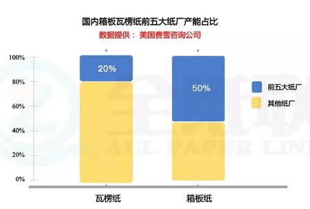 導語:最近紙張市場不是非常平靜,尤其是對瓦楞紙市場來說,那就更加跌宕起伏了。3月8日在慶祝女神節的當日,博匯的那臺國內單機規模最大的瓦楞紙線,終于呱呱落地,隨后,沒多久瓦楞紙市場的價格很快以二輪跌價,來迎接大紙機的誕生。 按說,新年伊始,萬物復蘇,市場需求也開始逐漸走旺。那邊文化紙的價格就一直在上漲。這邊就算是有了幾十萬噸博匯紙機的投產,相對瓦楞紙幾千萬噸的市場來看,比例還是很低的,照理說,應該市場的反應不至于如此強烈。 那么,我們就不禁要問了,這瓦楞紙的價格跌了,合理嗎? 首先這瓦楞紙產能的集中度是非常低的。如果我們看美國費雪公司提供的這個國內箱板瓦楞紙產能的集中度的對比數據來看,國內瓦楞紙的前五大紙廠產能集中度是非常低的,僅有20%的樣子,對比箱板紙的前5大紙廠的產能集中度50%的情況來看,差異還是非常大的。