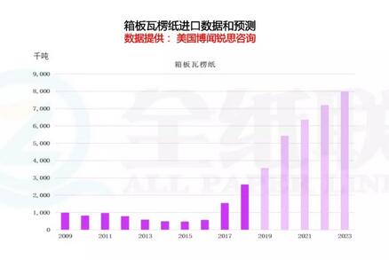 其次,瓦楞紙的原料困局,會直接拉大了,境外的廢紙和境內廢紙的價格差。自然就會刺激在境外投資廢紙漿廠和以廢紙為原料的紙廠,當然也包括瓦楞箱板。在未來的演變路徑中,廢紙漿和瓦楞紙的成品必然會逐漸加大了進口的趨勢,我們從美國瑞思咨詢公司,提供的預測數據,可以看到,未來成品紙的進口趨勢也會是非常明朗的。