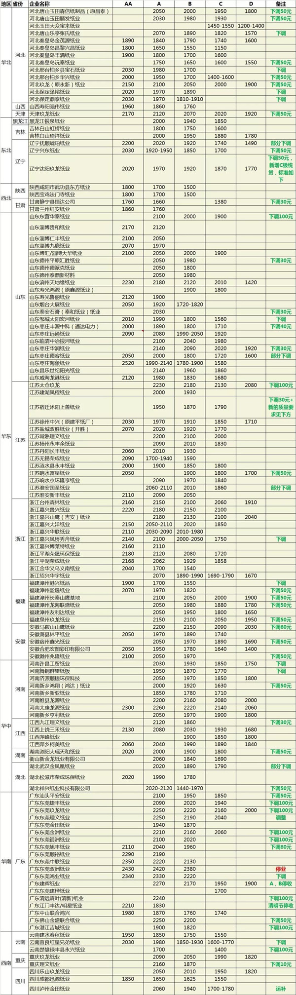 (4月4日的國廢價格) 國廢價格落到如今的局面,說到底,最主要原因還是原紙市場需求低迷所致。自3月份以來,紙價不斷下降,即便是龍頭紙廠玖龍紙業(yè)也在近一個月內(nèi)連降三次,原紙市場萎靡不振,廢紙需求量自然減少。 就目前而言,預(yù)計短期內(nèi)原紙市場恐將持續(xù)弱勢運行,難以企穩(wěn)回升,而國廢市場也會由此受到影響。 不過最大的變數(shù)在于,清明假期將至,目前已有十多家紙廠發(fā)布了停收通知。因此,清明假期過后,國廢價格或會出現(xiàn)小幅回升的現(xiàn)象。 東北地區(qū) 遼寧沈陽玖龍紙業(yè):清明節(jié)當(dāng)天(4月5日)停收國廢一天,請妥善安排裝運。 西南地區(qū) 重慶理文紙業(yè)通知:清明節(jié)(4月5日)停收國廢一天,請知悉并合理安排收、發(fā)貨。 華北地區(qū) 天津玖龍紙業(yè)通知:清明節(jié)當(dāng)天(4月5日)停收國廢一天,請妥善安排裝運。 河北玖龍(原永新)紙業(yè):清明節(jié)當(dāng)天(4月5日)停收國廢一天,請妥善安排裝運。 華東地區(qū) 福建泉州玖龍紙業(yè):清明節(jié)當(dāng)天(4月5日)停收國廢一天,其他時間正常收貨。 江蘇太倉玖龍紙業(yè):清明節(jié)當(dāng)天(4月5日)不收貨,其它時間正常收貨。 華南地區(qū) 廣東江門豐達(dá)/明星:(4月5日)周五清明節(jié),暫停一天收貨。 廣東東莞金洲紙業(yè):清明節(jié)當(dāng)天(4月5號)停收國廢一天,其余時間正常收貨。 廣東東莞理文紙業(yè):清明節(jié)當(dāng)天(4月5日)停收國廢一天,其余時間正常收貨。 廣東東莞玖龍紙業(yè)通知:清明節(jié)當(dāng)天(4月5日)停收國廢一天,其余時間正常收貨。 廣東東莞銀洲紙業(yè):清明節(jié)當(dāng)天(4月5日)停收國廢一天,其余時間正常收貨。 總的來看,目前國廢價格屬于較低水平,以A級國廢為例,其價格在2000元/噸上下,較高的為2200元/噸,較低的甚至降至1700元/噸,與昔日動輒3000元/噸的價位相比,可以說是已跌落神壇。 當(dāng)然,三四月份屬于淡季,紙品包裝產(chǎn)業(yè)鏈上下游企業(yè)普遍都遭遇到需求低下的情況,相信隨著時序的漸進(jìn),需求將會逐步迎來改善,價格也會回歸到正常水平。