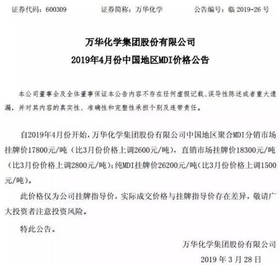 導(dǎo)語:當(dāng)前,3.21江蘇響水爆炸事故正在發(fā)酵,目前化工市場一片恐慌,波動(dòng)劇烈,漲價(jià)潮似乎已經(jīng)到來,部分產(chǎn)品甚至出現(xiàn)翻倍上漲的行情,像軟包裝用膠粘劑原料聚合MDI價(jià)格也已經(jīng)出現(xiàn)30%的上漲幅度。分析人士預(yù)測,后市這一波上漲行情也許會(huì)持續(xù)到二季度。 據(jù)了解,首先是化工巨頭萬華化學(xué)最新公告稱:根據(jù)化工企業(yè)生產(chǎn)工藝特點(diǎn),為確保生產(chǎn)裝置安全有效運(yùn)行,按照年度檢修計(jì)劃,本公司煙臺(tái)工業(yè)園 PDH 裝置(75 萬噸/年)將于 2019 年 4 月 1 日開始停車檢修,預(yù)計(jì)檢修 20 天左右。在此期間,煙臺(tái)工業(yè)園其他生產(chǎn)裝置正常運(yùn)轉(zhuǎn)。 膠粘劑原料MDI價(jià)格暴漲! 3月28日,萬華化學(xué)4月份聚合MDI價(jià)格將再次大幅上調(diào)。本次萬華化學(xué)中國地區(qū)聚合MDI分銷市場掛牌價(jià)17800元/噸(比3月份價(jià)格上調(diào)2600元/噸),直銷市場掛牌價(jià)18300元/噸(比3月份價(jià)格上調(diào)2800元/噸);純MDI掛牌價(jià)26200元/噸(比3月份價(jià)格上調(diào)1500元/噸)。這是自2019年開年以來,萬華化學(xué)MDI第三次漲價(jià)。