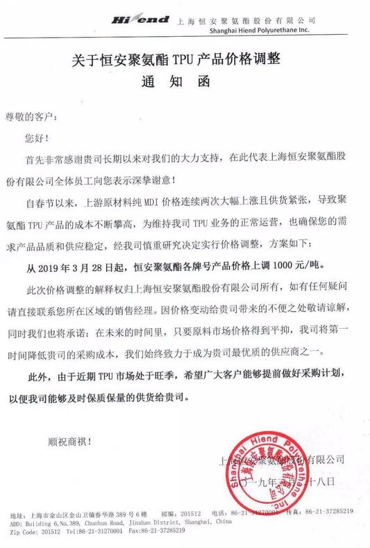 此前,萬華化學(xué)曾表示,15000元~18000元/噸的MDI價(jià)格對(duì)市場、企業(yè)和終端客戶而言都是一個(gè)比較舒適的價(jià)格區(qū)間。根據(jù)相關(guān)數(shù)據(jù)顯示2018年12月25日至2019年3月25日,3個(gè)月內(nèi),聚合MDI華東經(jīng)銷商價(jià)格從11575元漲至15000元以上。另據(jù)萬華化學(xué)三季報(bào)顯示,公司還有80億元的存貨。 隨著上游原材料MDI的大幅上漲,目前聚氨酯TPU等產(chǎn)品也因成本攀升,有了跟漲效應(yīng),上海恒安聚氨酯股份有限公司日前發(fā)布《通知函》稱:自春節(jié)以來,上游原材料純MDI價(jià)格連續(xù)兩次大幅上漲且供貨緊張,導(dǎo)致聚氨酯TPU產(chǎn)品的成本不斷攀高,為維持公司正常運(yùn)營,也確保下游供貨穩(wěn)定,從2019年3月28日起,恒安聚氨酯各牌號(hào)產(chǎn)品價(jià)格上調(diào)1000元/噸。