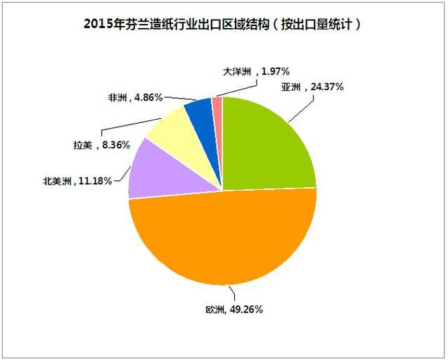 數據來源:中研普華 2、造紙行業客戶結構 芬蘭造紙行業產品主要用于出口,客戶遍布全球,自用比例較小。2014年芬蘭紙及紙板出口比例約92.7%,自用比例7.2%。2015年出口比例92.6%,自用比例7.4%。2016年出口比例92.3%,自用比例7.7%。 3、造紙行業需求的地區差異 芬蘭造紙行業產品主要用于出口,需求區域存在一定的差異。最主要的是歐洲,其次是亞洲及美洲。具體份額見下圖。 近年來芬蘭造紙行業供給情況以及市場規模分析 圖表:2015年芬蘭造紙行業出口區域結構(按出口量統計)