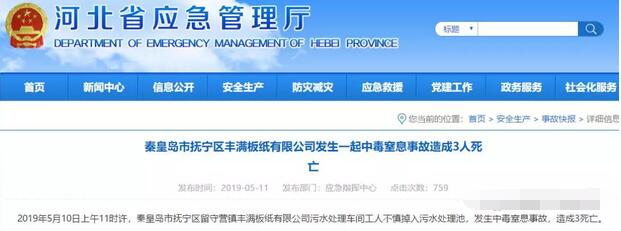 5月11日,河北省應急管理廳發布消息稱,5月10日上午11時許,秦皇島市撫寧區留守營鎮豐滿板紙有限公司污水處理車間工人不慎掉入污水處理池,發生中毒窒息事故,造成3人死亡。