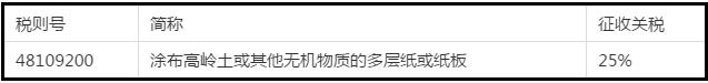 2019年5月9日,美國政府宣布,自2019年5月10日起,對從中國進口的2000億美元清單商品加征的關稅稅率由10%提高到25%。美方上述措施導致中美經貿摩擦升級,中方不得不對原產于美國的部分進口商品調整加征關稅措施。根據《中華人民共和國對外貿易法》《中華人民共和國進出口關稅條例》等法律法規和國際法基本原則,經黨中央、國務院批準,國務院關稅稅則委員會決定,自2019年6月1日0時起,對已實施加征關稅的600億美元清單美國商品中的部分,提高加征關稅稅率,分別實施25%、20%或10%加征關稅。其中白板紙的征收關稅增加25%。 白板紙稅則號及征收關稅情況表