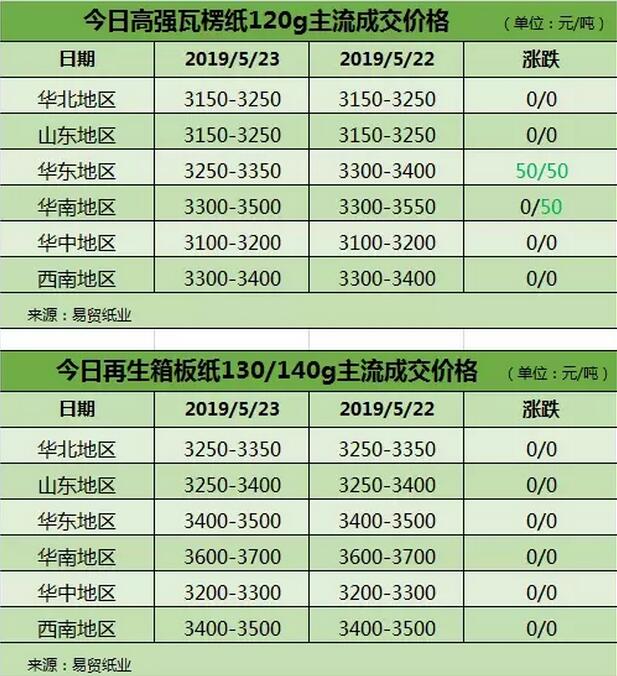 (數據來源于易貿紙業) 廢紙市場分析 包裝紙需求下滑,廢紙價格自然也難以上漲。盡管近幾日部分地區的國廢價漲跌互現,但總體來說,仍處于下調的趨勢。目前,華北地區多數紙廠貨量減少,打包站出貨不積極,其他地區也有類似情況發生。 在外廢方面,美廢市場報盤氣氛冷清,場內買盤較少,零星成交實單以商談為主。價格12#參考135-140美元/噸,9#參考230-240美元/噸。 最新紙價行情 目前,下游包裝廠訂單水平處于低位,紙廠出貨情況普遍不佳。根據相關數據顯示,當前國內高強瓦楞紙120克主流成交價格在3100-3500元/噸,再生箱板紙130/140克主流成交價格在3200/3500元/噸。 根據易貿紙業對5月23日紙價行情的統計,江西、吉林、四川、江蘇、湖北、福建、廣東、山東、河北9省20家紙廠的瓦楞紙、箱板紙、紗管紙報價相對較低。紙業市場處于低谷,紙廠的生存壓力極大。 以下為5月23日的紙價行情。需要說明的是,由于市場變化太快,個別廠家價格可能會有變動,具體價格請以廠家實際報價為準,以下僅供參考: 江西 江西新洪興紙業:高瓦120克報價3300元/噸(出廠含稅現金)。 吉林: 吉林白山市琦祥紙業:高瓦120克報價3600元/噸(出廠含稅現金)。 四川: 四川樂山玖龍紙業:高瓦70克報價3950元/噸(出廠含稅現金); 四川瀘州金田紙業:高瓦120克報價3380元/噸(出廠含稅現金)。 江蘇: 江蘇飛翔紙業:高瓦80克報價3650元/噸(出廠含稅承兌); 江蘇長豐紙業:高瓦120克報價3500元/噸,T級箱板紙130克報價3600元/噸(出廠含稅承兌)。 湖北: 湖北祥興紙業:高瓦120克報價3200元/噸(出廠含稅現金); 湖北宜昌翔陵紙業:紗管紙B及報價3300元/噸,高瓦120克報價3400元/噸,T級箱板紙140克報價3500元/噸(出廠含稅現金)。 福建: 福建華發紙業:高瓦120克報價3300元/噸(出廠含稅現金); 福建榮信紙業:高瓦120克報價3200元/噸,再生箱板紙130克報價3450元/噸(出廠含稅現金); 福建盈晟紙業:高瓦120克報價3400元/噸(出廠含稅現金)。 廣東: 東莞金洲紙業:高瓦120克報價3610元/噸,箱板紙Q級130克報價3830元/噸,箱板紙H級126克報價4560元/噸(出廠含稅現金)。 東莞銀洲紙業:普瓦90克報價2560元/噸,箱板紙T級130克報價3730元/噸(出廠含稅現金); 江門明星紙業:箱板紙N級160克報價4000元/噸(出廠含稅現金)。 山東: 山東德州寶典紙業:紗管紙C級報價2250元/噸 ,紗管紙B2級報價2550元/噸(出廠未稅現金); 山東臨沂利華紙業:高瓦120克報價3300元/噸,仿牛卡110克報價3400元/噸(出廠含稅現金); 山東棗莊恒宇紙業:紗管紙C級360克-600克報價2500元/噸,高瓦90克報價3400元/噸(出廠含稅現金)。 河北: 河北保定鼎泰紙業:普瓦80克報價3050元/噸,高瓦120克報價3100元/噸(出廠未稅現金)。 河北保定東方造紙:高瓦120克報價3200元/噸(出廠含稅現金); 河北秦皇島金茂源紙業:高瓦120克報價3250元/噸,紗管紙B級200型報價3900元/噸(出廠含稅現金)。