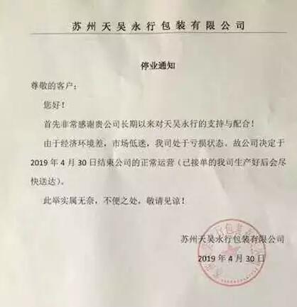 4月30日,蘇州天吳永行包裝有限公司發布停業通知: