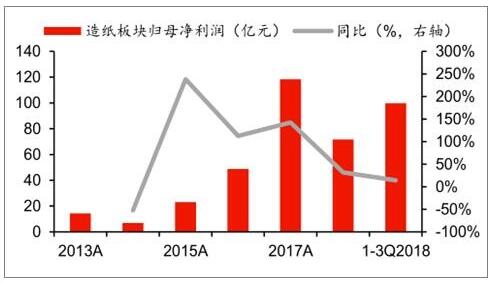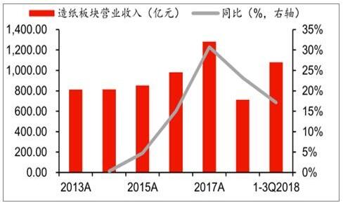 2018年中國造紙行業(yè)市場概況 供給端,2018年下半年開始行業(yè)新增產(chǎn)能投產(chǎn)增多,預(yù)計(jì)2018-2019年整體新增產(chǎn)能在1400萬噸;需求端,與宏觀經(jīng)濟(jì)關(guān)聯(lián)性較高的包裝紙、銅版紙需求或?qū)⒊袎海┬韪窬诸A(yù)計(jì)在2019年將有所惡化,供需關(guān)系從緊平衡轉(zhuǎn)向供給過剩。 至2018年9月底造紙板塊累計(jì)固定資產(chǎn)投資完成額達(dá)到2137萬元,累計(jì)同比增長5.8%,較2017年底1.2%的同比增速有顯著回升。 2018年前三季度造紙板塊實(shí)現(xiàn)營收1079億元,同比增長17%;實(shí)現(xiàn)歸母凈利潤100億元,同比增長14%。三季度旺季需求不及預(yù)期,成品紙價(jià)格出現(xiàn)回調(diào),同時(shí)原材料價(jià)格高位震蕩,Q3單季板塊營收增速回落至7%,歸母凈利增速下滑至-0.2%。 2013-2018年前三季度中國造紙板塊營業(yè)收入、歸母凈利潤統(tǒng)計(jì)及增長情況