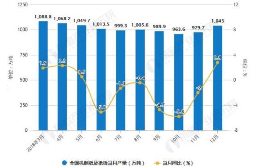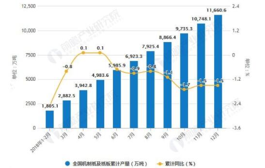 數(shù)據(jù)來源:公開資料、前瞻產(chǎn)業(yè)研究院整理 2018年全國機(jī)制紙及紙板產(chǎn)量已超億噸 據(jù)前瞻產(chǎn)業(yè)研究院發(fā)布的《中國造紙行業(yè)發(fā)展前景與投資戰(zhàn)略規(guī)劃分析報(bào)告》統(tǒng)計(jì)數(shù)據(jù)顯示,2018年1-3季度全國機(jī)制紙及紙板產(chǎn)量波動(dòng)幅度較小,整體呈下降趨勢,2018年3-4季度全國機(jī)制紙及紙板產(chǎn)量下降;2018年12月全國機(jī)制紙及紙板產(chǎn)量為1043萬噸,同比增長2.8%。2018年1-12月全國機(jī)制紙及紙板產(chǎn)量為11660.6萬噸,同比下降1.5%。 2018年1-12月全國機(jī)制紙及紙板產(chǎn)量統(tǒng)計(jì)及增長情況