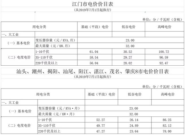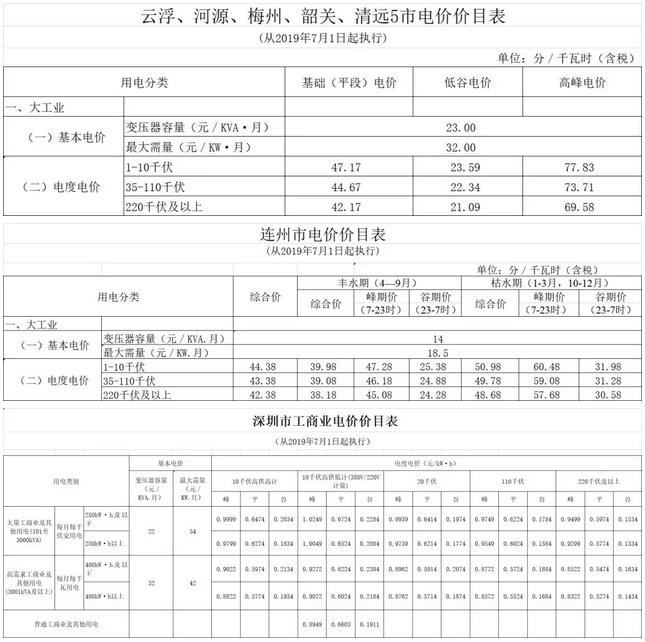 全省除深圳市外一般工商業電度電價每千瓦時統一降低5.39分(含稅,下同)。深圳市“普通工商業及其他用電”的平段電價每千瓦時降低7.18分,峰段和谷段的電價按原有比價同比例降低;深圳市“大量工商業及其他用電”、“高需求工商業及其他用電”電度電價每千瓦時統一降低0.93分。上述規定自2019年7月1日起執行。