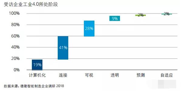 ▲ 工業4.0發展路徑 除了政府的支持,亞洲企業更積極打破行業壁壘加快新產品開發。不同于歐美同類企業,中國領先企業間的合作屢見不鮮,一些知名范例包括:百度與小米在物聯網與人工智能領域合作開發更多應用場景;騰訊與京東合作布局電子商務生態圈;印度系統集成商組成AI聯盟(如OpenAI)。這賦予它們驚人的影響力,也意味著它們擁有可用于快速推動創新的技術實力和資本基礎。 中國是亞洲智能化轉型的重要力量。政府加強智能制造頂層設計,開展試點示范和標準體系建設;企業加快數字化轉型,提升系統解決方案能力。中國智能制造取得明顯成效,進入高速成長期。 中國智能制造進入成長期主要體現在三方面:首先,中國工業企業數字化能力素質提升,為未來制造系統的分析預測和自適應奠定基礎。第二、財務效益方面,智能制造對企業的利潤貢獻率明顯提升。第三、典型應用方面,中國已成為工業機器人第一消費大國,需求增長強勁。 企業智能化的六大階段 企業數字化能力素質體現在其利用數據指導生產以及系統自優化的能力。我們借鑒國際普遍認可的工業4.0發展路徑,將企業智能化成熟度分為六個階段:計算機化、連接、可視、透明、預測和自適應。 計算機化 企業通過計算機化高效處理重復性工作,并實現高精度、低成本制造。但不同的信息技術系統在企業內部獨立運作,很多設備并不具備數字接口。 連接 相互關聯的環節取代各自為政的信息技術。操作技術(OT)系統的各部分 實現了連通性和互操作性,但是依舊未能達到IT層面和OT層面的完全整合。 可視 了解正在發生什么,通過現場總線和傳感器等物聯網技術,企業捕獲大量的實時數據,建立起企業的“數字孿生”,從而改變以前基于人工經驗的決策方式,轉為基于數字進行決策。 透明 了解事件發生的原因,并通過根本原因分析生成認識。 預測 將數字孿生投射到未來,模擬不同的情景對未來發展進行預測,并適時做出決策和采取適當措施。 自適應 預測能力只是自動化行為和決策的根本要求,而持續的自適應則使企業實現自主響應,以便其盡快適應變化的經營環境。 隨著中國兩化融合和工業物聯網建設等多項舉措推進,制造型企業數字化能力素質顯著提升,大部分企業正致力于數據縱向集成。德勤調研結果顯示,81%的受訪企業已完成計算機化階段,其中41% 處于連接階段,28%處于可視階段,9%處于透明階段,而預測和自適應階段的企業各自占2%。