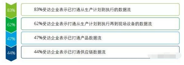 ▲ 生產數據流主要類型 產品數據流 打通產品數據流主要體現在產品全生 命周期數字一體化和產品全生命周期可追溯。產品全生命周期數字一體化以縮短研發周期為核心,主要應用基于模型定義(MBD)技術進行產品研發、建設 產品全生命周期管理系統(PLM)等。研發是數字化工廠“數據鏈條”的起點, 研發環節產生的數據將在工廠的各個系統間實時傳遞,數據的同步更新避免了傳統制造企業經常出現的由于溝通不暢產生的差錯,也使得工廠的效率大大提升,縮短產品研制周期。產品全生命周期可追溯以提升產品質量管控為核心。 主要應用是讓產品在全生命周期具有唯一標識,應用傳感器、智能儀器儀表、工控系統等自動采集質量管理所需要數據,通過MES系統開展在線質量檢測和預警等。 供應鏈數據流 打通供應鏈數據流主要體現在供應鏈上下游協同優化,實現網絡協同制造。主要應用是建設跨企業制造資源協同平臺,實現企業間研發、管理和服務系統 的集成和對接,為接入企業提供研發設計、運營管理、數據分析、知識管理、信息安全等服務,開展制造服務和資源的動態分析和柔性配置。 德勤調研結果顯示,目前企業致力于打通從ERP到MES乃至現場設備的數據流,但這也僅是從生產到執行的打通,未來 還需將產品數據、供應鏈數據串聯。我們將生產數據流分為兩個環節:一、打通生產計劃與執行系統的數據流;二、執行與監控和現場設備的數據流。 結果顯示, 83%的受訪企業表示已打通ERP和MES的數據流打通。62%的企業繼續向 下打通MES到現場設備的數據流。但僅有47%的企業打通了產品數據流,44%的企業打通供應鏈數據流。而且考慮到我們調查的企業均為資質較好且為中等以上規模,這一系列比率顯然高于中國整體平均水平。