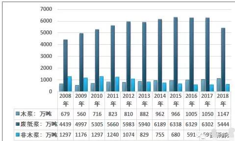 資料來源:智研咨詢整理 我國紙漿消費量位居全球第一,產量僅次于美國,居全球第二位,未來我國造紙產業還有巨大的發展空間。造紙工業發展是以森林資源可持續發展為基礎,而目前我國的森林資源遠不能滿足日益發展的制漿造紙工業的需要,為彌補原料供應的不足,每年要從國外進口相當數量的紙漿,我國已經成全球第一大進口國。 據統計2008年以來除2013年以及2018年國內需求下降以外,其余年度均保持增長態,2008年以來我國紙漿年均消耗增速超過2.5%;總體而言我國紙漿的消耗依然是以國產為主,進口紙漿為輔。其中國產紙漿消耗量近年來逐漸趨于穩定,然而每年通過進口而消耗的紙漿總量卻在逐年增加,2018年我國進口紙漿消耗總量創歷史新高,達到2196萬噸。 2008-2018年我國進口紙漿消耗量統計圖