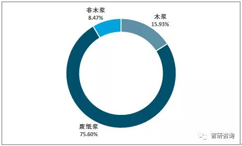 資料來源:智研咨詢整理 2018年我國紙漿總產量為7201萬噸,其中木漿產量為1147萬噸,占同期國內紙漿總產量的15.93 %;廢紙漿作為國內最大的紙漿產品品種,2018年廢紙漿產量為5444萬噸,占比為75.60%;非木漿產量為610萬噸,產量占比為8.47%。 2008-2018年我國紙漿產品結構示意圖