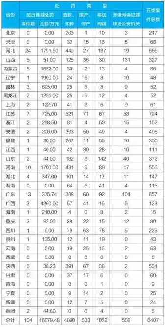 前4月,全國共查處五類案件6407件。其中,按日連續處罰案件104件,罰款金額16079.48萬元;查封、扣押案件4090件;,限產、停產案件633件;移送行政拘留1078起。