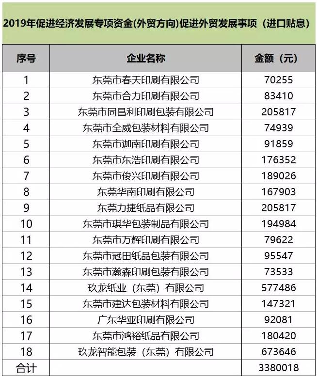 導(dǎo)語:近日,東莞市商務(wù)局發(fā)布《關(guān)于撥付2019年促進(jìn)經(jīng)濟(jì)發(fā)展專項(xiàng)資金(外貿(mào)方向)促進(jìn)外貿(mào)發(fā)展事項(xiàng)(進(jìn)口貼息)的通知》,小編了解到,18家印刷包裝企業(yè)獲得補(bǔ)貼。 東莞18家印刷包裝企業(yè)獲商務(wù)局進(jìn)口貼息,共計(jì)約338萬元 近日,東莞市商務(wù)局發(fā)布《關(guān)于撥付2019年促進(jìn)經(jīng)濟(jì)發(fā)展專項(xiàng)資金(外貿(mào)方向)促進(jìn)外貿(mào)發(fā)展事項(xiàng)(進(jìn)口貼息)的通知》,200多家企業(yè)將獲得進(jìn)口貼息共計(jì)3000多萬元,其中,印刷包裝企業(yè)有18家,共計(jì)獲得進(jìn)口貼息約338萬元。