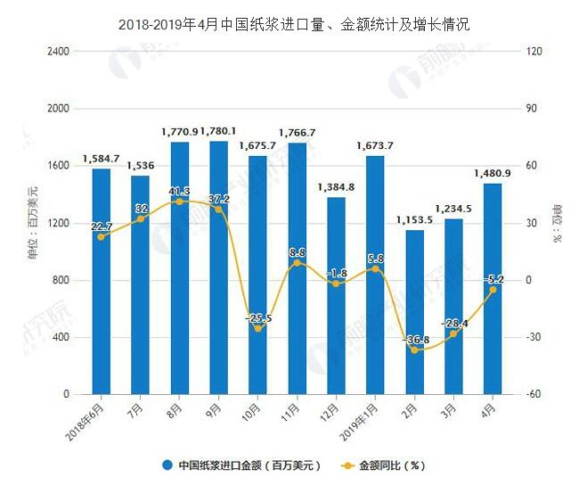 在進口金額方面,2018年1-4季度中國紙漿進口金額波動幅度較小,2019年4月中國紙漿進口金額為1480.9百萬美元,同比下降5.2%。2019年1-4月中國紙漿進口金額為5541.72百萬美元,同比下降5.2%。