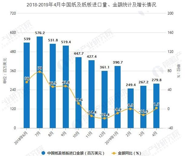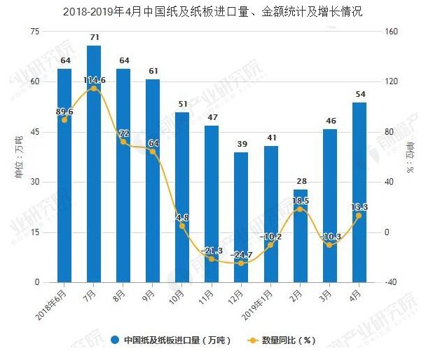 2019年4月中國紙及紙板進口量累計達到170萬噸