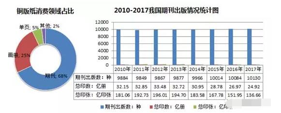 隨著電子媒體的開發(fā),2017年,期刊出版共10130種,總印數(shù)24.92億冊,總印張136.66億印張。與上年相比,總印數(shù)降低7.59%,總印張降低10.06%;我國期刊出版總印張數(shù)呈下降狀態(tài),文化用紙需求預計仍將低迷。