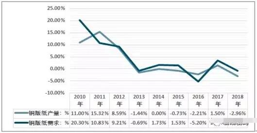2010-2018年我國銅版紙產(chǎn)銷增速走勢圖