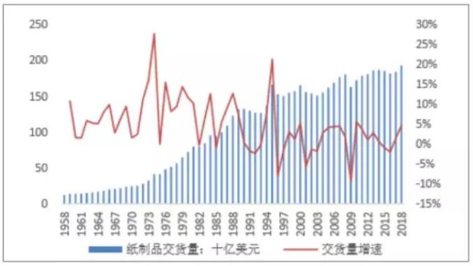 導語:今天我們一起看一下美國造紙行業的發展歷程、業務模式以及行業現狀。作為全球造紙行業最為發達的國家,美國造紙業的發展或許能夠給我們一些啟發。 美國造紙行業歷程:發展步入成熟期后期,頹勢漸顯 造紙行業是一個依靠產能驅動的行業,根據固定資產投資、行業規模等數據,將美國造紙行業分為四個階段。 1、第一階段(1970年之前):需求拉動行業發展 第一階段(1970年之前)的發展主要是靠需求拉動。這一階段的固定資產投資較少,而影響造紙行業的人均可支配收入增長較快。而且數據顯示,美國在1970年之前的紙制品交貨量增速也比較可觀,年增速基本在5%左右。這一階段,美國工業整體也處于快速擴張時期,造紙行業的產能利用率達到90%。 美國紙制品交貨