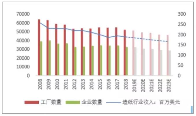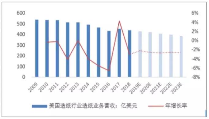 數據來源:公開資料整理 。2)文化用紙增長乏力,可替代性較強 美國學齡兒童數量經過上世紀末的快速增長,進入21世紀之后維持基本穩定,增長率幾乎為0。此外,根據美國人口普查局的預測數據,美國未來的人口粗出生率還將不斷下降。新生兒的減少,將會直接導致學齡兒童數量的減少,因此預期由教學引致的文化用紙需求將會有所下降。 對文化用紙需求產生影響的另一因素是電子傳媒產品。據統計,電子書在2013年之前經過井噴式增長之后,增長速度逐漸轉負,紙質書市場略有回暖。究其原因,是因為在2014年,美國主要的電子書銷售平臺與亞馬遜就電子書達成代理協議、電子書重新實行代銷制,售價抬高,嚇退消費者。盡管美國目前電子書銷售出現了下滑,陷入發展的瓶頸期,但是電子書相較于紙質書,具有便捷、環保的特點,同時互聯網的普及使盜版電子書的獲取、流通成本幾乎為零,因此預期在電子書的發展趨于規范之后,電子書有望進一步擴大其在圖書市場的份額。 (3)生活用紙需求穩定,可替代性極低 近幾年來,美國生活用紙銷售規模以1%~2%的速度穩步增長,與美國人均可支配收入基本保持同步增長,二者的增長趨勢比較一致?紤]到生活用紙的必選消費屬性,美國生活用紙被替代的可能性極低,但與此同時,結合美國經濟平穩增長的趨勢,生活用紙市場規模也不太可能出現大幅的擴張。 3、產業鏈:上游原材料供給充足,下游需求平穩增長 行業的議價能力可以從產業鏈的角度進行分析。造紙行業的上游行業是制漿、林木行業等,而下游則對接包裝、印刷等行業以及終端消費。造紙行業對上游的議價能力,可以從上游行業的企業數量、原材料的供給量以及造紙企業是否有向上游拓展業務來衡量。 具體來說,當上游呈現出下面的特點時,則造紙行業與上游的議價能力就越強: 、偕嫌纹髽I數量越多,造紙行業與上游的議價能力就越強; ②原材料供給越多,造紙行業與上游的議價能力就越強; 、墼旒埿袠I向上游拓展其業務,造紙行業與上游的議價能力就越強。 造紙行業對下游的議價能力可以從下游行業的企業數量、下游行業對造紙行業產品的需求量以及產品同質化程度等指標來衡量。 具體來說,當下游呈現出下面的特點時,則造紙行業與下游的議價能力就越強: 、傧掠纹髽I數量越多,或需求越分散,造紙行業與下游的議價能力就越強; 、谙掠螌堉破返男枨笤酵ⅲ旒埿袠I與下游的議價能力就越強; 、墼旒埿袠I的產品同質化程度越低,造紙行業與下游的議價能力就越強。 美國造紙行業經過環保立法的去產能以及行業自身的兼并,目前僅有140余家造紙企業,CR10近年來維持在90%以上。造紙行業企業數量少,行業集中度很高,導致美國造紙行業在產業鏈上下游的議價能力相對較強。除此之外,美國造紙行業的原材料供給也十分充裕。 紙漿方面,2017年,全球紙漿總產量為18576.3萬噸,而其中美國的紙漿產量就達到了4835.1萬噸,占全球紙漿總產量的26.03%,紙漿出口量達到715.1萬噸,占全球紙漿總出口量的12.13%。美國在廢紙方面的優勢同樣明顯,2017年全球廢紙總出口量達到5699萬噸,而美國是全球最大的廢紙出口國,出口廢紙達到1828.9萬噸,占全球廢紙出口量的比重達到32.09%。 美國的廢紙回收率也非常高,近年來,美國廢紙回收率維持在70%上下,廢紙供給較為充足?梢姡绹旒埿兴璧脑牧稀垵{及廢紙的供應都比較充裕。此外,美國造紙行業的龍頭公司如國際紙業等,大多擁有公司自有林地,或通過收購兼并等,拓展自己的上游制漿業務,逐步完善產業鏈布局,對上游的依賴程度較低,因此美國造紙行業與上游的議價能力也相對較強。 美國造紙行業下游議價能力方面,可以分紙種進行分析。 包裝用紙方面,美國的紙包裝行業已經發展的十分成熟,紙包裝市場規模已經能達到包裝市場總規模的50%以上,下游包裝行業對包裝用紙的需求較為旺盛。此外,美國造紙行業的龍頭企業,如國際紙業、WestRock、PackagingCropofAmerica等,都在自身的造紙業務之外,都有向下游拓展其包裝業務,而且紙包裝業務甚至已經成為個別公司的主要業務。行業向下游的業務拓展,在完善了自己的產業鏈之余,也解決了行業下游的產品議價問題。 生活用紙方面,從下游的需求方來看,生活用紙直接面向消費者,因此購買方相對分散,生活用紙制造商相對更有市場勢力,議價能力相對更強。目前美國人均生活用紙消費量已經達到20千克/年以上,在全球范圍內屬于領先水平。而且隨著美國經濟的進一步發展,人民生活水平的提升,生活用紙的需求會被進一步情境化,將會更多異質性的生活用紙需求產品涌現出來,以滿足消費者不同的細分生活用紙需求。結合生活用紙的剛性需求,下游消費者對生活用紙的需求會保持穩定增長,生活用紙生產商的下游議價能力相對強勢。 文化用紙則有所不同,隨著電子傳媒等新興閱讀方式的興起,紙質書的需求會逐步降低。作為一個需求導向型的行業,需求的低迷將會迫使造紙企業降低產品價格。換言之,造紙企業的議價能力較低。此外,和生活用紙、特種紙相比,文化用紙的產品異質性更弱,產品之間的同質性特點更為明顯。換言之,不同造紙企業的產品之間的替代性較強,行業議價能力也會因此而受到削弱。 綜合上述對美國造紙行業市場競爭格局及上下游的分析,美國造紙行業經過多年的發展,目前處于行業集中度極