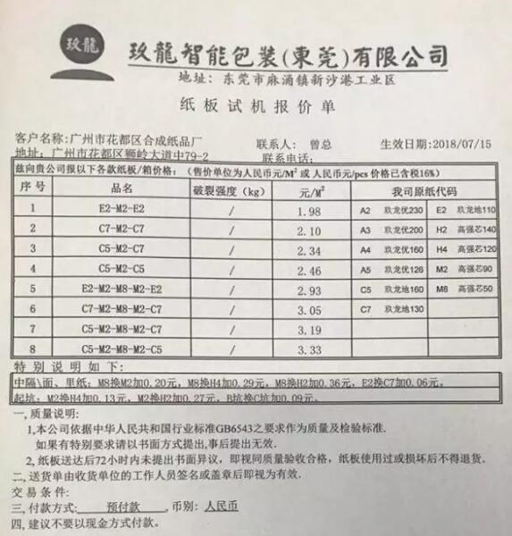 收購后,該集團將直接參與供應包裝產品予客戶,并在包裝業上游及下游整合服務平臺方面產生協同效應,從而向客戶提供專業及個人化的包裝及全面綜合優質服務。上游及下游整合可向終端客戶提供一站式服務,有利于穩定包裝紙的質量及售價以及建立良性競爭的包裝紙市場。 近年來,整條紙包裝產業鏈徹底由過去的增量市場轉為存量市場,由于產能擴充太快,包裝紙供大于求的局面一直得不到緩解,造成玖龍等包裝紙巨頭不得不降價求售,大大壓縮了贏利空間。 此次收購的發生,意味著玖龍向下游包裝印刷業亮出了底牌,原有的競爭格局將被打破,一些拼成本、拼走量的紙板和紙箱企業將首先面臨玖龍包裝的競爭。 猶記得一年前的7月20日,一張玖龍智能包裝(東莞)有限公司的《紙板試機報價單》低調流入市場,剎那間,整個珠三角的紙板及紙箱行業陷入了一片刀光血影之中。按照東莞紙板行業人士的估算,該報價與同行同等規格的至少低了10%,每平米價差達可達0.50元之多。
