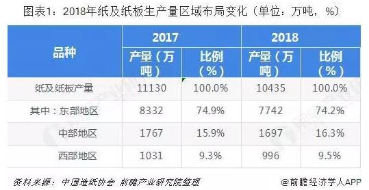 中國造紙行業整體集中度較低,個別紙種市場相對成熟。中國造紙行業受第二階段的環保政策收緊的影響,2010年-2015年間造紙行業共計淘汰落后產能近4000萬噸,行業去產能效果初步顯現,紙及紙板的產銷量增長速度都有所放緩,行業供需進入弱平衡時期。 區域集中度與往年差異不大 根據中國造紙協會調查資料,2018年我國東部地區11個省(區、市),紙及紙板產量占全國紙及紙板產量比例為74.2%;中部地區8個省(區)比例占16.3%;西部地區12個省(區、市)比例占9.5%。