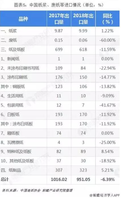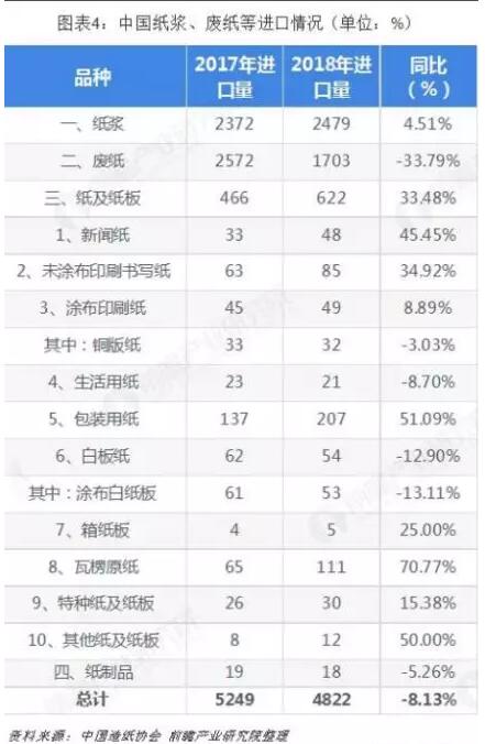 紙及紙板、紙漿、廢紙及紙制品進出口情況 (一)紙及紙板、紙漿、廢紙及紙制品進口情況 2018年紙及紙板進口622萬噸,較上年增長33.48%;紙漿進口2479萬噸,較上年增長4.51%;廢紙進口1703萬噸,較上年增長-33.79%;紙制品進口18萬噸,較上年增長-5.26%。 2018年進口紙及紙板、紙漿、廢紙、紙制品合計4822萬噸,較上年增長-11.18%,用匯302.12億美元,較上年增長15.67%。進口紙及紙板平均價格為888.99美元/噸,較上年平均價格增長-1.36%;進口紙漿平均價格為795.31美元/噸,較上年平均價格增長22.99%;進口廢紙平均價格為252.03美元/噸,較上年平均價格增長10.33%(見表4)。