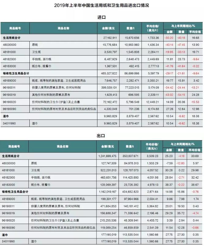 根據海關統計數據,2019年上半年中國生活用紙和衛生用品進出口情況分析如下: