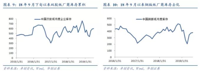 木漿系產業鏈庫存仍待去化,廢紙系產業鏈庫存調整尚需時日 木漿系產業鏈:成品紙價格的調整,貿易商木漿庫存高位延續,7月底青島港木漿庫存達到130萬噸,常數港木漿庫存達到78.8萬噸,兩港庫存均創新高。短期針葉漿外盤價格略有回升,闊葉漿外盤價格持續下行,港口高庫存驅動現貨價格下行。 廢紙系產業鏈: 去年9月以來隨著下游需求疲弱,廠商持續去化廢紙及成品紙庫存,7月底廠商黃板紙庫存達到5.38天,箱板瓦楞紙7月價格下跌,市場需求持續疲軟,需求疲軟致使前期價格序列調整,行業庫存持續攀高,產業鏈庫存調整尚需時日。
