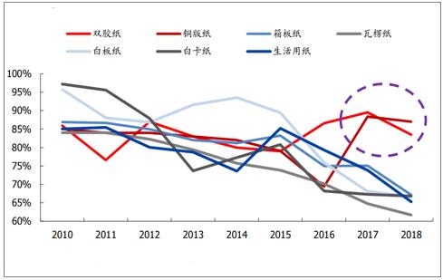 數據來源:公共資料整理 2.文化紙行業開工率維持相對高位,供求處于平衡狀態。 文化紙中雙膠銅版紙開工率自2010年來維持70%以上,2017~2018年開工率在85%以上,在各成品紙中最高,表明行業供求基本處于平衡狀態。2018年雙膠紙產量/表觀消費量分別為861/848萬噸,分別同比變動-1.5%/2.6%;銅版紙產量/表觀消費量分別為574/500萬噸,分別同比變動-1.6%/1.2%。 雙膠銅版紙開工率維持相對高位