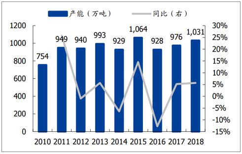 數據來源:公共資料整理 3.產能增長放緩,2019年無新增產能投放。 銅版紙產能自2012年持續下降,2018年產能未增長。2018年晨鳴投放100萬噸雙膠紙產能,其他上市紙企無新增雙膠紙產能,2018年雙膠紙產能凈增55萬噸至1031萬噸。根據當前大型紙廠擴建計劃,2019年沒有新增雙膠銅版紙產能。 雙膠紙產能及同比增速