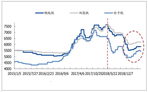數據來源:公共資料整理 5.從短期的需求波動來看,文化紙庫存已經降至低位,補庫需求將成為紙價上漲重要驅動力。 經歷2017H2~2018H1造紙行業過熱周期,中間環節庫存處于高位。2018年4月白卡紙價格戰開始,白卡紙首先開始降價,木漿系銅板雙膠紙價格聯動性下跌,并且在高庫存壓力下,行業被動進入去庫周期,白卡/雙膠/銅版紙價格從2018年4月6660/7483/7500元/噸跌至2019年2月4943/6017/5533元/噸。 6.中間環節庫存降至低位,表現為淡季不淡,19H1紙價開始回升并企穩。 銅板、雙膠和白卡紙從2019年2月開始發布漲價函,截至2019年5月共發布5輪漲價函,落實4輪,白卡/雙膠/銅版紙分別提價500/200/300元/噸。6月進入文化紙需求淡季,并且在木漿價格下降背景下,三大紙種價格保持穩定并未下滑。表明下游庫存較低,淡季仍存在補庫需求,因此淡季不淡,8月旺季來臨,預計木漿系成品紙價格仍有上漲空間。補庫需求支撐下,預計木漿系成品紙利潤向350元/噸左右的合理水平回歸。 木漿系成品紙價格走勢