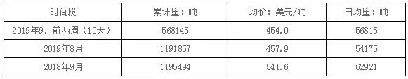 據巴西發展工業和外貿部(MDIC)統計,2019年9月份前2周(10個工作日,本月剩余11個工作日),巴西共出口紙漿56.81萬噸,平均日均出口5.68萬噸,平均出口價格為454.0美元/噸。