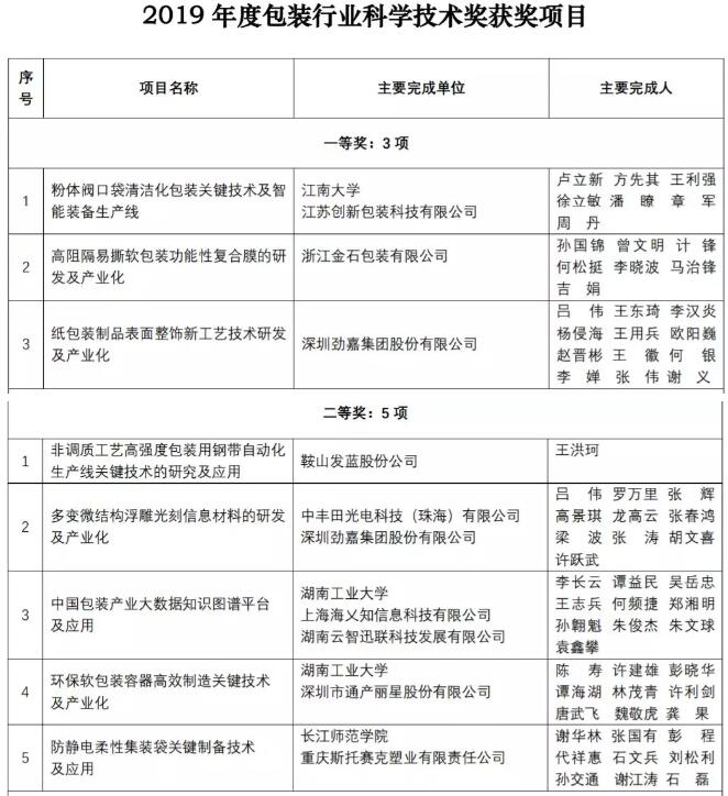 根據(jù)《包裝行業(yè)科學(xué)技術(shù)獎(jiǎng)勵(lì)辦法》的規(guī)定,經(jīng)包裝行業(yè)科學(xué)技術(shù)獎(jiǎng)勵(lì)評(píng)審委員會(huì)評(píng)審、包裝行業(yè)科學(xué)技術(shù)獎(jiǎng)勵(lì)管理委員會(huì)審定,并經(jīng)中國(guó)包裝聯(lián)合會(huì)和中國(guó)包裝有限責(zé)任公司批準(zhǔn),決定2019年度包裝行業(yè)科學(xué)技術(shù)獎(jiǎng)授獎(jiǎng)項(xiàng)目共21項(xiàng)。其中:授予 “粉體閥口袋清潔化包裝關(guān)鍵技術(shù)及智能裝備生產(chǎn)線”3項(xiàng)項(xiàng)目科學(xué)技術(shù)獎(jiǎng)一等獎(jiǎng);授予“非調(diào)質(zhì)工藝高強(qiáng)度包裝用鋼帶自動(dòng)化生產(chǎn)線關(guān)鍵技術(shù)的研究及應(yīng)用”等5項(xiàng)項(xiàng)目科學(xué)技術(shù)獎(jiǎng)二等獎(jiǎng);授予“高精度印刷軟打樣技術(shù)的開(kāi)發(fā)與應(yīng)用”等13項(xiàng)項(xiàng)目科學(xué)技術(shù)獎(jiǎng)三等獎(jiǎng)。