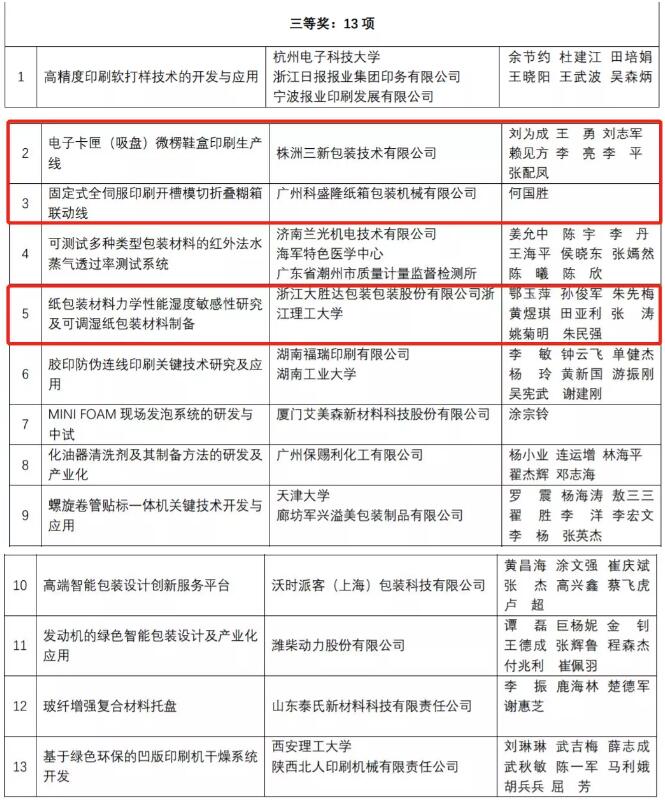 小編整理發(fā)現(xiàn),株洲三新包裝技術(shù)有限公司“電子卡匣(吸盤)微楞鞋盒印刷生產(chǎn)線”,廣州科盛隆紙箱包裝機(jī)械有限公司“固定式全伺服印刷開(kāi)槽模切折疊糊箱聯(lián)動(dòng)線”,以及浙江大勝達(dá)包裝股份有限公司/浙江理工大學(xué)“紙包裝材料力學(xué)性能濕度敏感性研究及可調(diào)試紙包裝材料設(shè)備”,分別獲三等獎(jiǎng)。