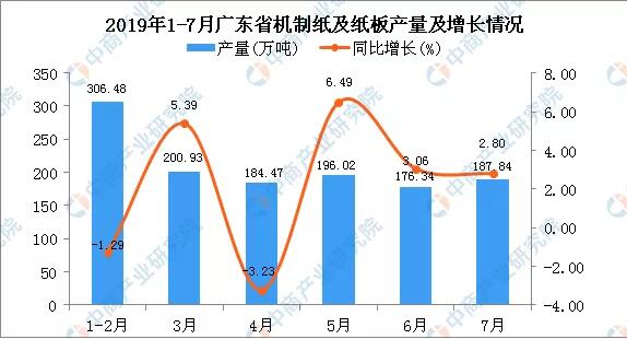 (▲數(shù)據(jù)來源:中商產(chǎn)業(yè)研究院數(shù)據(jù)庫) 廣東省 2019年1-2季度廣東省機(jī)制紙及紙板產(chǎn)量有所增長,2019年7月廣東省機(jī)制紙及紙板產(chǎn)量為187.84萬噸,同比增長2.8%。2019年1-7月廣東省機(jī)制紙及紙板產(chǎn)量為1270.68萬噸,同比增長3.34%。