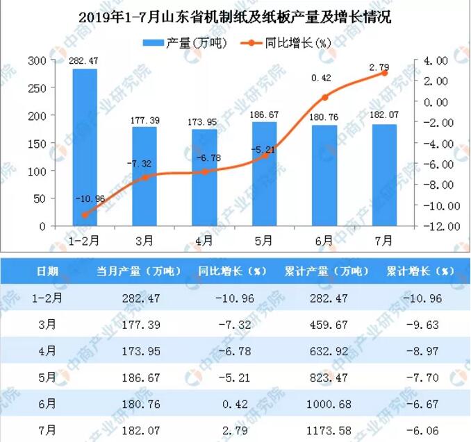 山東省 2019年1-2季度山東省機(jī)制紙及紙板產(chǎn)量有所增長,2019年7月山東省機(jī)制紙及紙板產(chǎn)量為182.07萬噸,同比增長2.79%。2019年1-7月山東省機(jī)制紙及紙板產(chǎn)量為1173.58萬噸,同比下降6.06%。