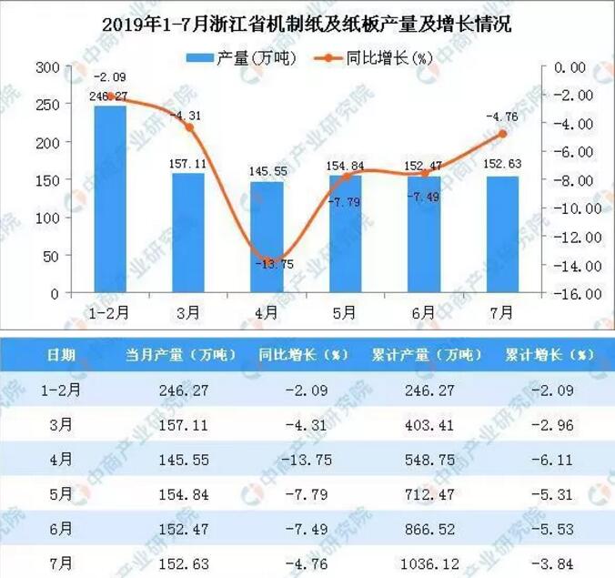 浙江省 2019年1-2季度浙江省機(jī)制紙及紙板產(chǎn)量有所增長,2019年7月浙江省機(jī)制紙及紙板產(chǎn)量為152.63萬噸,同比下降4.76%。2019年1-7月浙江省機(jī)制紙及紙板產(chǎn)量為1036.12萬噸,同比下降3.84%。