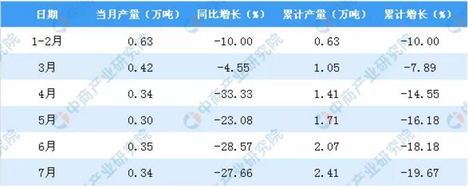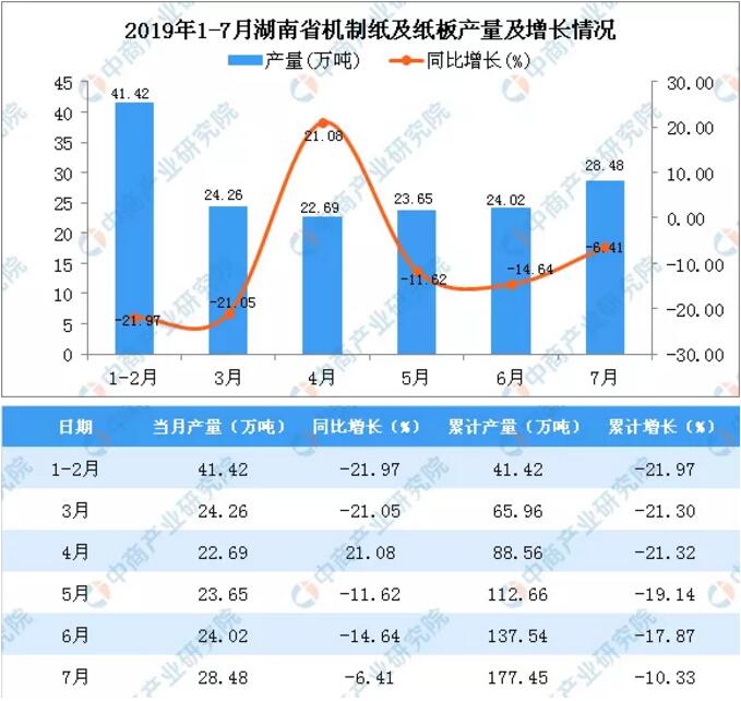 湖南省 2019年1-2季度湖南省機(jī)制紙及紙板產(chǎn)量有所增長,2019年7月湖南省機(jī)制紙及紙板產(chǎn)量為28.48萬噸,同比下降6.41%。2019年1-7月湖南省機(jī)制紙及紙板產(chǎn)量為177.45萬噸,同比下降10.33%。