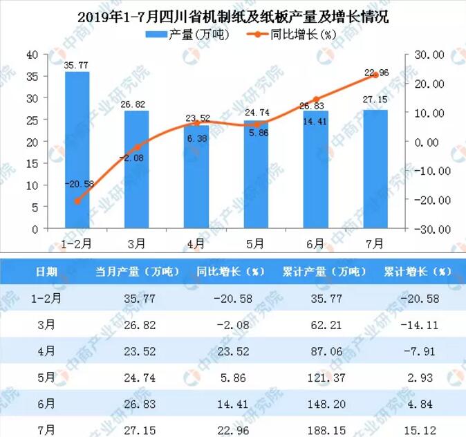 四川省 2019年1-2季度四川省機(jī)制紙及紙板產(chǎn)量有所增長,增長19.97%。2019年7月四川省機(jī)制紙及紙板產(chǎn)量為27.15萬噸,同比增長22.96%。2019年1-7月四川省機(jī)制紙及紙板產(chǎn)量為188.15萬噸,同比增長15.12%。