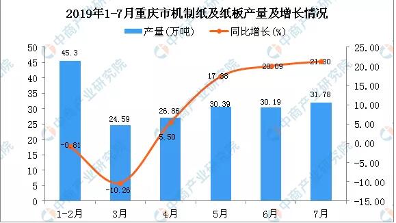 重慶市 2019年1-2季度重慶市機(jī)制紙及紙板產(chǎn)量有所增長,2019年7月重慶市機(jī)制紙及紙板產(chǎn)量為31.78萬噸,同比增長21.3%。2019年1-7月重慶市機(jī)制紙及紙板產(chǎn)量為194.15萬噸,同比增長10.46%。
