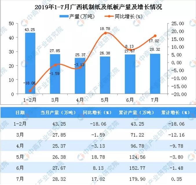 廣西省 2019年1-2季度廣西機(jī)制紙及紙板產(chǎn)量有所增長,2019年7月廣西機(jī)制紙及紙板產(chǎn)量為28.32萬噸,同比增長17.02%。2019年1-7月廣西機(jī)制紙及紙板產(chǎn)量為179.9萬噸,同比增長0.35%。