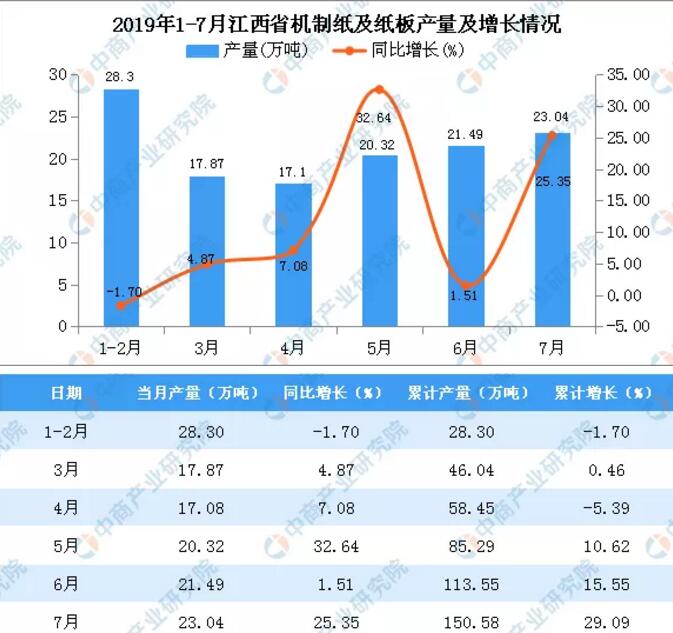 湖北省 2019年1-2季度湖北省機(jī)制紙及紙板產(chǎn)量有所增長,2019年7月湖北省機(jī)制紙及紙板產(chǎn)量為32.53萬噸,同比增長4.67%。2019年1-7月湖北省機(jī)制紙及紙板產(chǎn)量為214.42萬噸,同比增長11.98%。 河南省 2019年1-2季度河南省機(jī)制紙及紙板產(chǎn)量有所增長,2019年7月河南省機(jī)制紙及紙板產(chǎn)量為34.47萬噸,同比下降22.5%。2019年1-7月河南省機(jī)制紙及紙板產(chǎn)量為230.7萬噸,同比下降38.22%。 江西省 2019年1-2季度江西省機(jī)制紙及紙板產(chǎn)量有所增長,2019年7月江西省機(jī)制紙及紙板產(chǎn)量為23.04萬噸,同比增長25.35%。2019年1-7月江西省機(jī)制紙及紙板產(chǎn)量為150.58萬噸,同比增長29.09%。