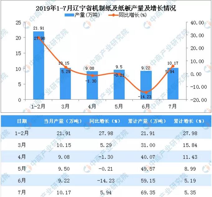 遼寧省 2019年1-2季度遼寧省機(jī)制紙及紙板產(chǎn)量有所下降,2019年7月遼寧省機(jī)制紙及紙板產(chǎn)量為10.17萬噸,同比增長5.94%。2019年1-7月遼寧省機(jī)制紙及紙板產(chǎn)量為69.35萬噸,同比增長5.35%。